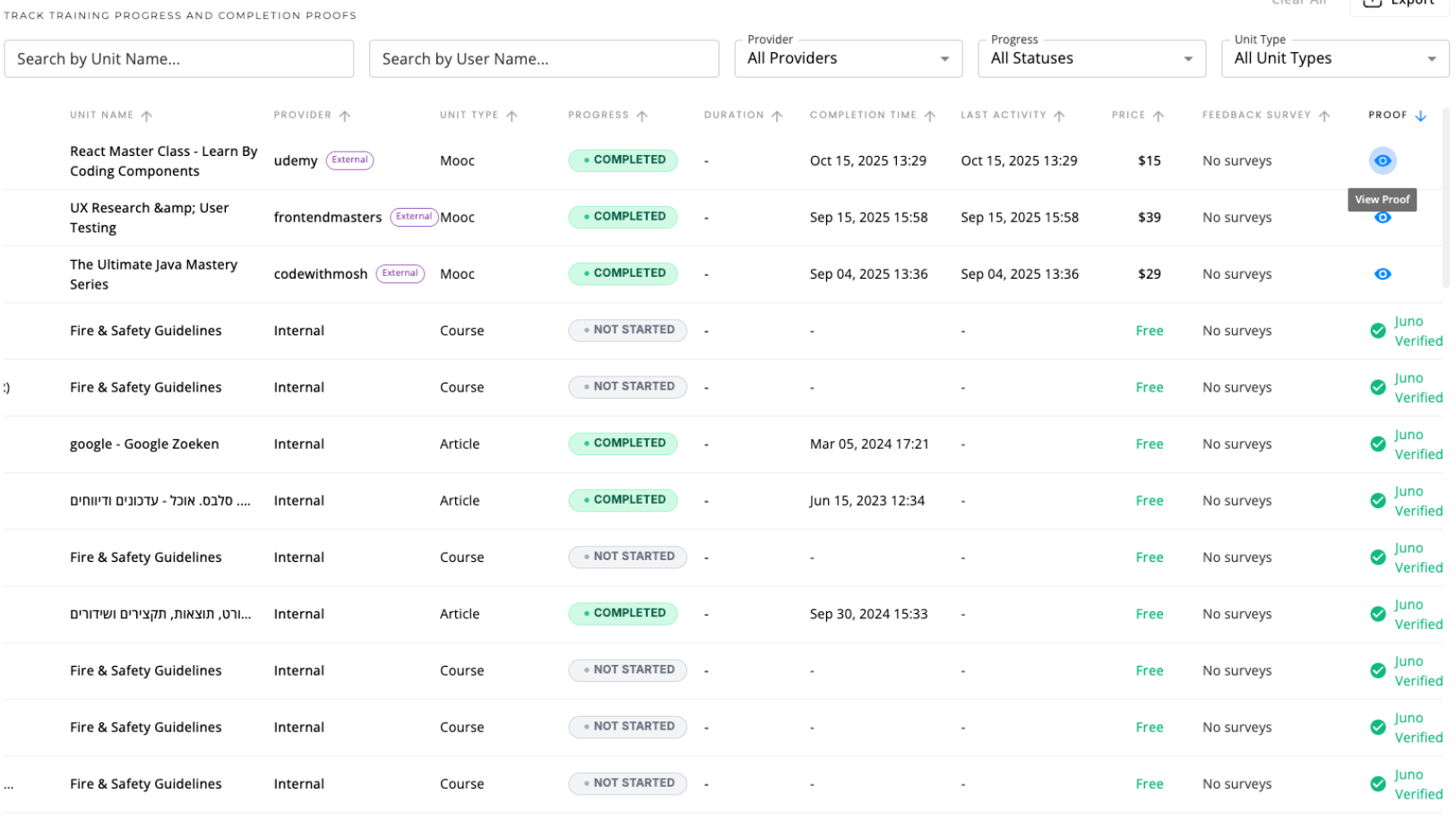 We have introduced a new learning management table that serves as a single, centralized location for all user learning data. This comprehensive table provides administrators with an unparalleled overview, enabling comprehensive oversight, detailed reporting, and simplified adherence to European compliance requirements.