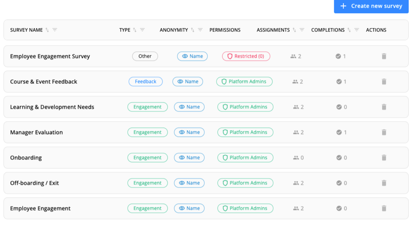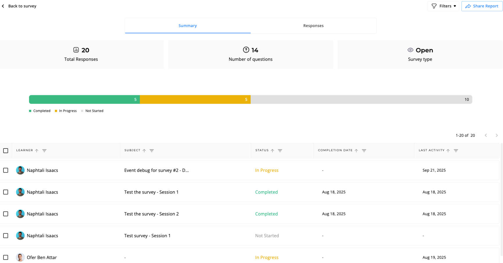 General Tab - Survey View Displays all survey responses in a unified view with inline user actions (now only delete user response). Bring course-level user management capabilities directly into survey analytics for immediate response to feedback.